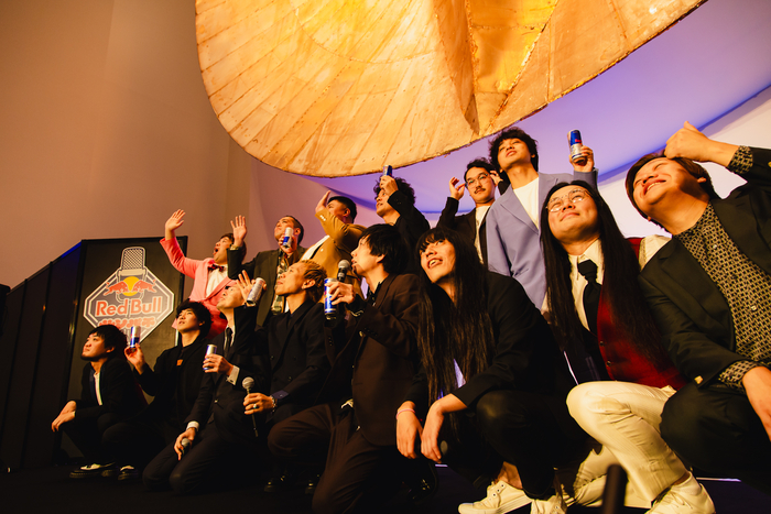 各回の演者が全員集合するエンディング。イベントの締めくくりとなる第二部では、最若手ながらステージ中央を陣取ったイチゴに対し、「何やねん。お前らバチくそおもろいやんけ」と金属バットの友保が絶賛。その後は、全員がレッドブルを片手にお待ちかねの撮影タイム。