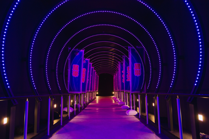 イベント当日、別館へと続くパビリオンの通路には各演者のコンビ名が入ったのぼりが掲げられ、ライトアップも相まって近未来空間へと進んでいくような不思議な気分に。会場に足を踏み入れると、直径10.6mもある巨大な黄金の顔が目に飛び込んできて、その迫力に圧倒される。各演者名をデザインしたロゴステッカー、アクリルキーホルダー、チケットホルダーが手土産として配布され、すでに観客の気分も上々。