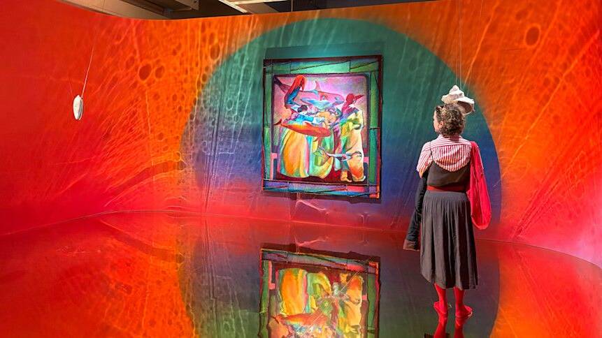 作品に向かい、右側の奥のオブジェは、潜水具を着た人間のようです。カラフルなオブジェに包まれ、海の生物に同化したのでしょうか。