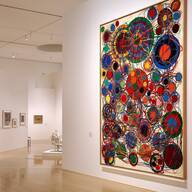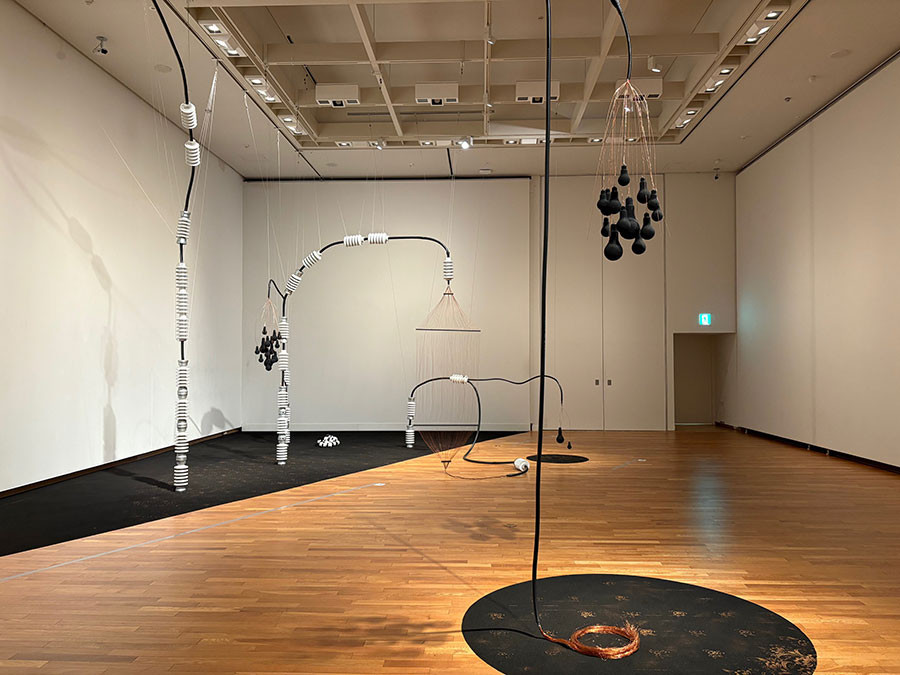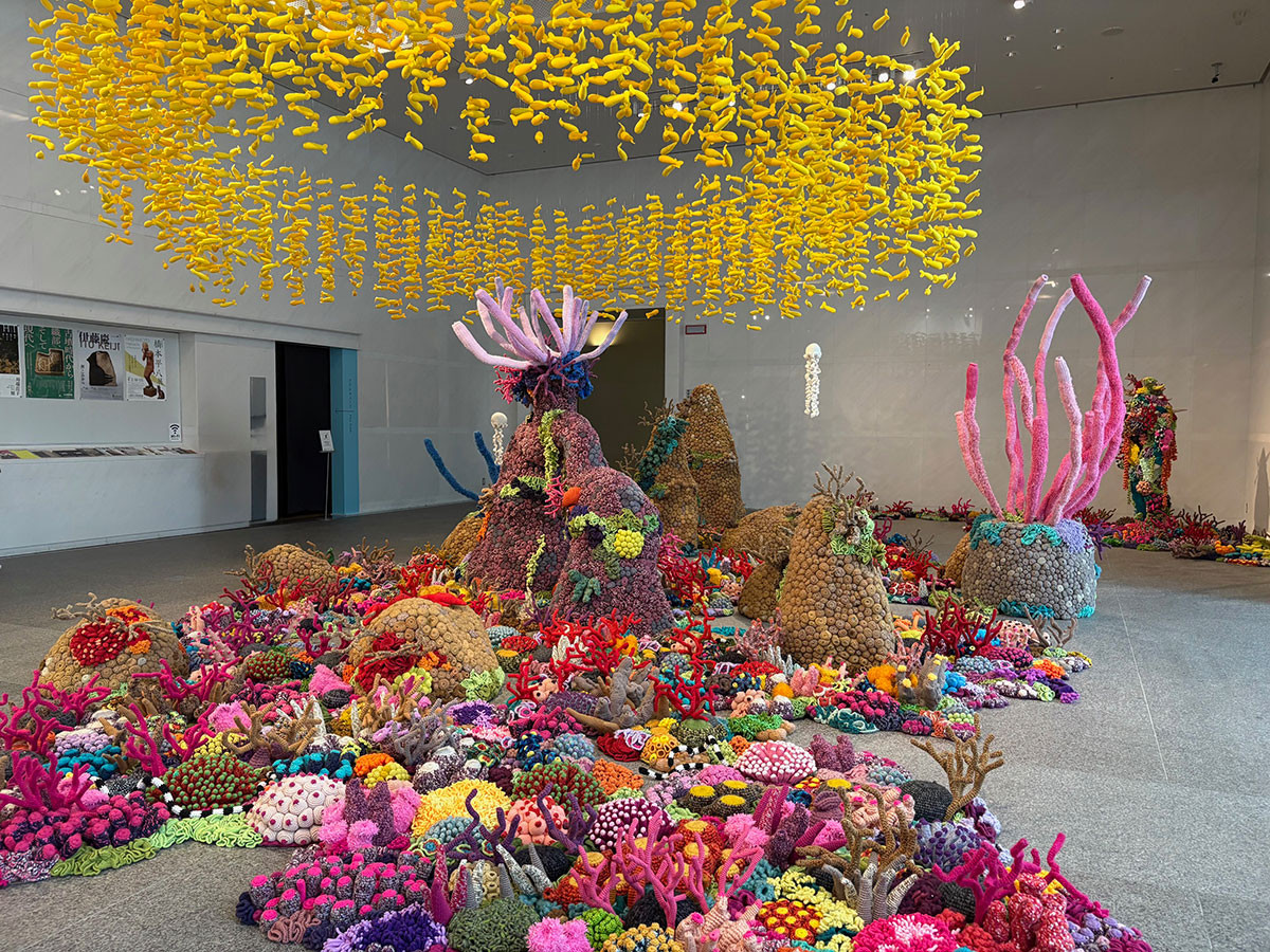 ムルヤナの作品は、とてもカラフルで、熱帯地方の海岸で見られるサンゴ礁のようです。天井から吊り下げられた黄色のオブジェを見て、「エビフリャー」に見えると、話しているグループもありました。 実は、写真には写っていませんが、手前側には同じような形状で白色のオブジェが展示されています。カラフルで生命感のある部分と、白色で沈黙が広がる部分の対比は、温暖化による海洋環境の悪化への危機感を表現しているようです。