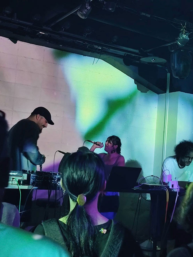 今回、芸術祭のオープニングを飾り、新栄のクラブでスペシャルなイベントが行われました。そこでは、パレスチナの現在を体感するパフォーマンスが繰り広げられ、とにかく熱気がすごかったです。周りを見ると、常連のような人々、クラブで踊りなれた人々、おしゃれをして展覧会に出かけ、そのまま立ち寄った人々が思い思いに楽しんでいました。その場の混沌とした空間が非日常的で、いかにも芸術祭が始まったことを実感しました。