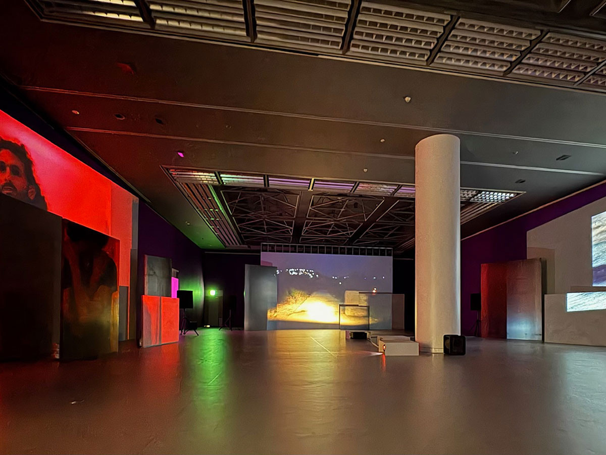 バゼル・アッバス&ルアン・アブ=ラーメの作品は、真っ暗な空間と大音量の音楽、映像で構成されます。重なり合う大小さまざまなスクリーンに投影される映像は、不穏な気配が漂うストリートの風景や、厳重な防護服を着た警察関係者が誰かを取り囲む様子など、見ていて心地よいものではありません。 今回、彼らはパフォーミングアーツにも参加しています。