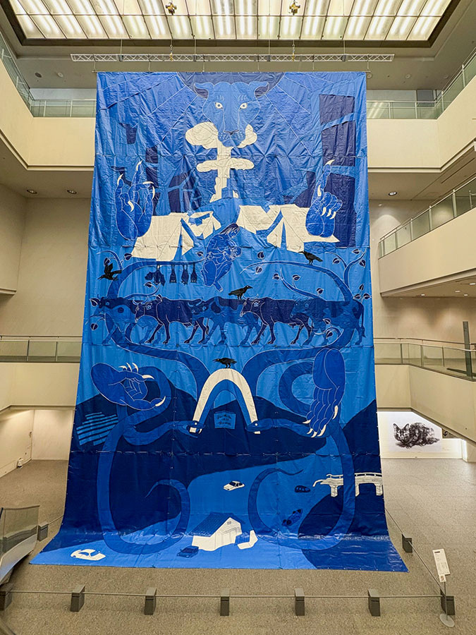 その他に、B2FのフォーラムⅡには、久保寛子の大きなブルーシートの作品があります。表現されているのは、獅子の顔に4本の腕を持つ、東洋の神様のようです。見るからに強そうですが、その表情はユーモラスです。