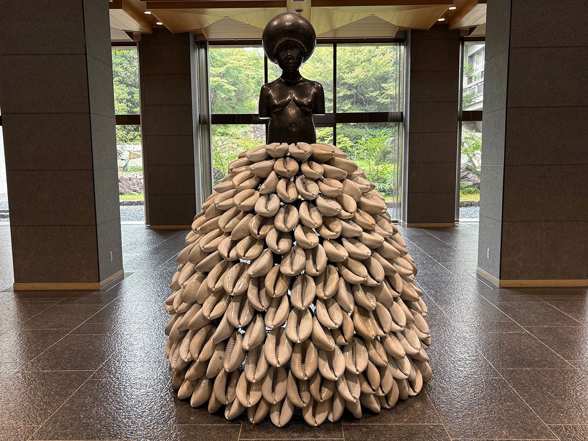 シモーヌ・リーの作品は、美術館の地下フロアに展示されています。近づくと、2メートルを超える、その大きさに驚きます。上半身を見ると、肌の黒い女性のようですが、無表情です。それから、ひじのあたりから先がありません。腰のあたりから下は、白い大きな貝殻をいくつも繋げた大きなスカートをはいています。作品の顔と向き合う方向から眺めると、貝殻の隙間から、ところどころ光が漏れ、その輝きがスカートを一層、高価な品物に見せるようです。