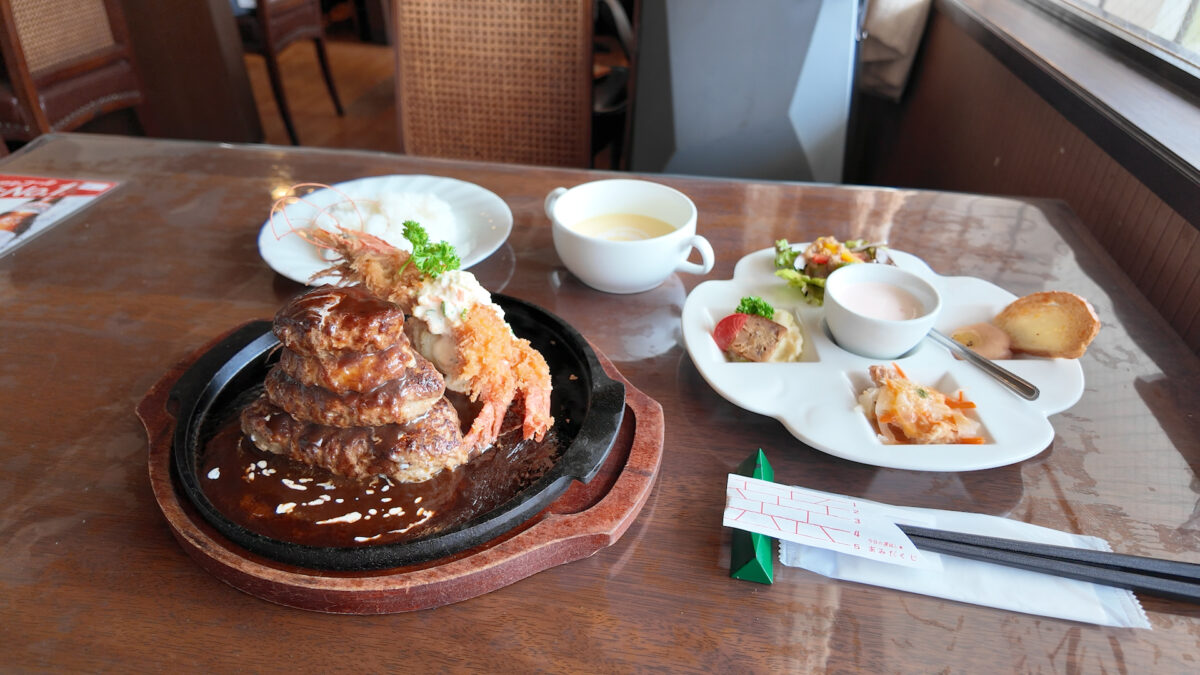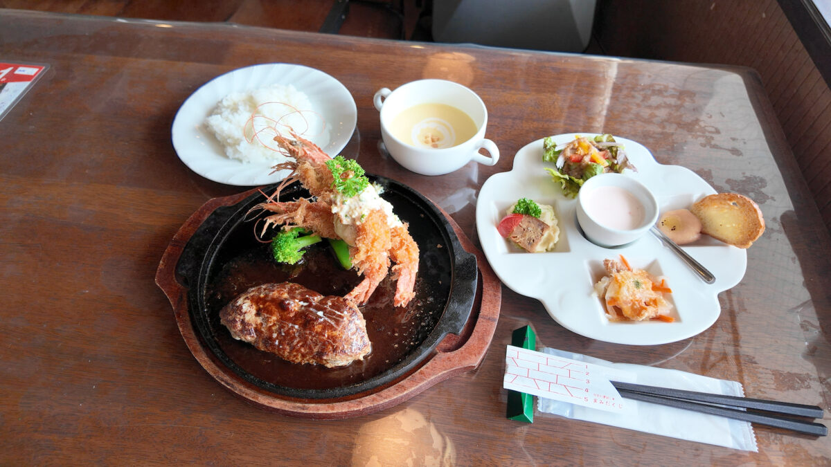美味しそうなハンバーグと綺麗に盛り付けられた海老フライ。デミグラスソースの良い香りがしてとても美味しそうです。これに前菜5種盛り合わせと、スープ、ライスがついた定食でボリュームも申し分ないですね。