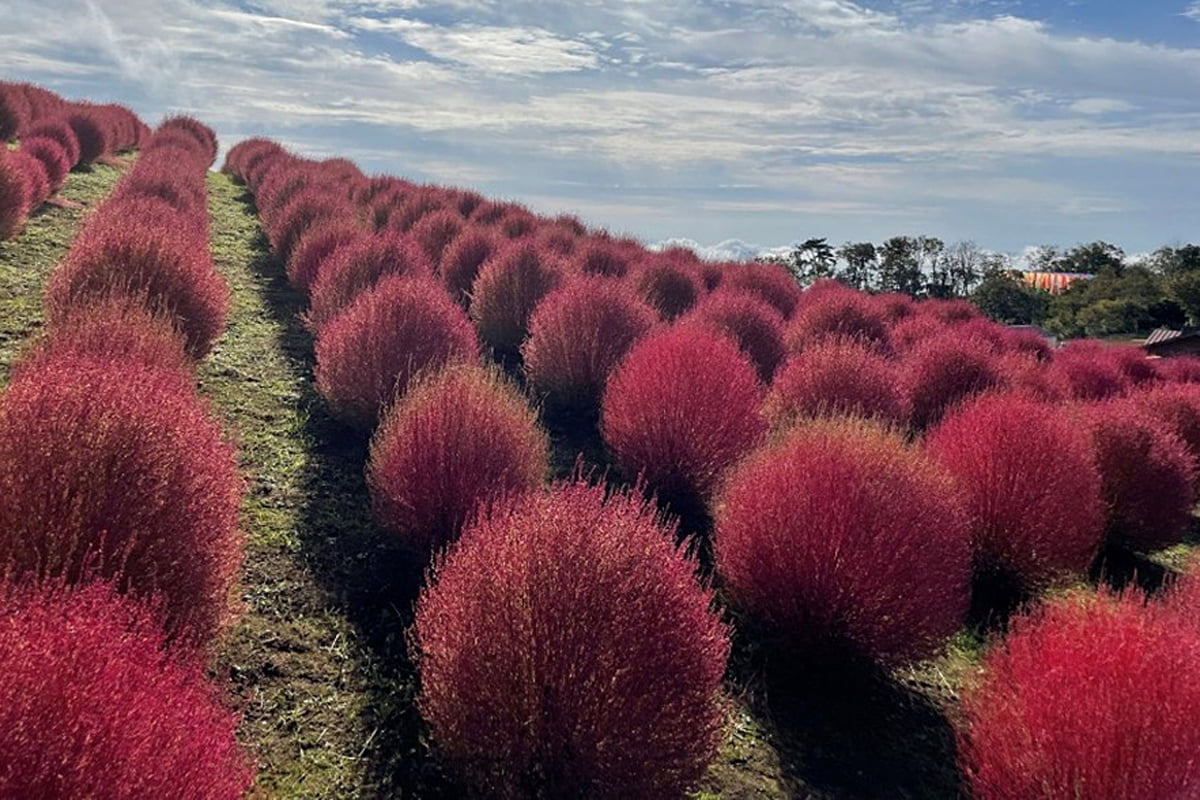 標高680mの箱館山の山頂に位置するリゾート施設「びわこ箱館山」は、琵琶湖を一望できる人気スポット。秋が訪れ、夏には鮮やかな緑色だった約8,000株のコキアが、紅葉して真紅に染まります。丸みを帯びた形がかわいらしいコキアが、辺り一面を彩る風景は秋の風物詩です♪