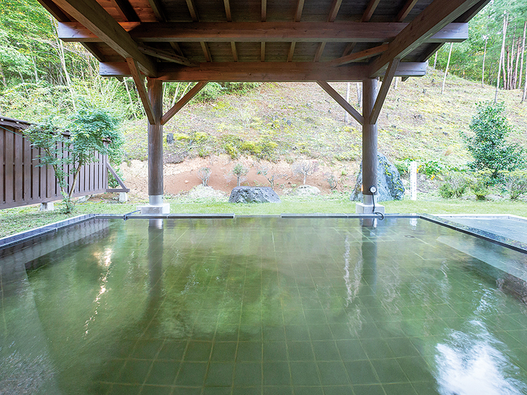 「東風(こち)の台運動公園」内にある温泉施設『きつねうち温泉』。自家源泉のpH値9.5のアルカリ性の湯を堪能できる。大きな屋根付き露天風呂の他、大浴場には広い洗い場とサウナを備える。とろみのある湯で疲れを癒やそう。