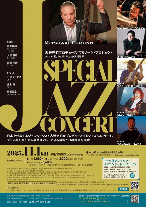 晩秋の盛岡で、一夜限りのジャズの祭典が花開く。11月1日、キャラホール(盛岡市都南文化会館)で開催される『古野光昭プロデュース 「フルノーツ・プロジェクト with 小沼ようすけ・井上銘・馬場智章 SPECIAL JAZZ CONCERT』は、大ベテランの古野光昭(プロデュース/ベース)を筆頭に、今をときめくジャズミュージシャンが大集合。大都市のフェスでもめったに見られないような、豪華メンバーを揃えたスペシャルコンサートだ。