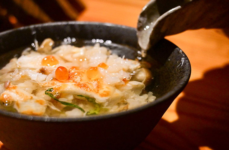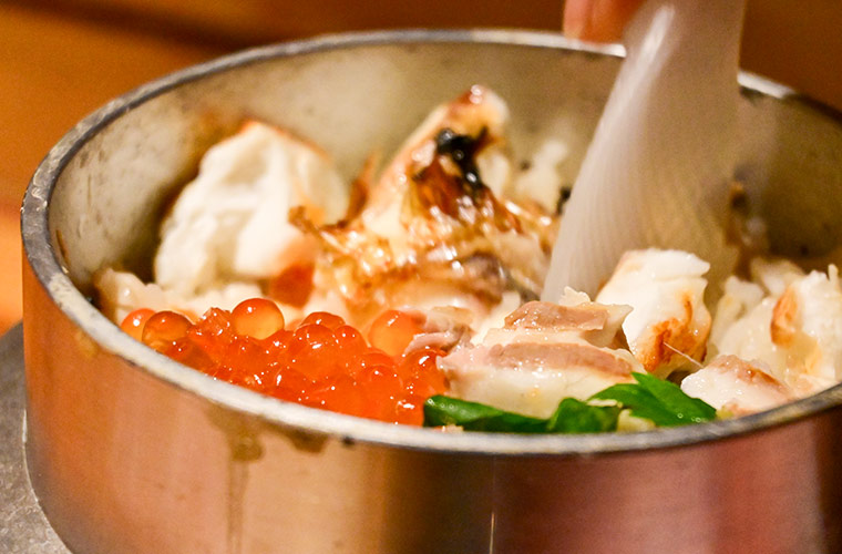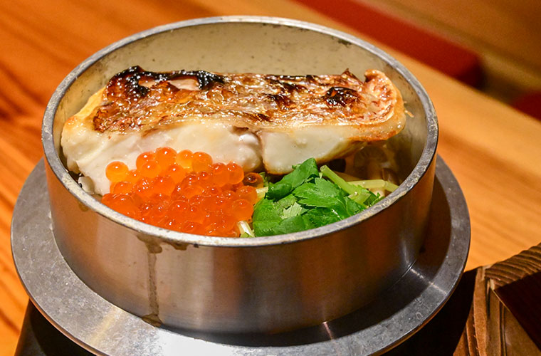食事の〆におすすめしたいのが、今やリピーター続出の人気メニュー『鯛の釜めし』。使用するのは、刺身でも食べられるほど新鮮な真鯛。その身を軽く炙り、一番出汁でふっくら炊き上げたご飯に豪快にのせ、さらにイクラの醤油漬けをトッピング。釜に入りきらないほど大ぶりな切り身からも、店の本気度がうかがえます。