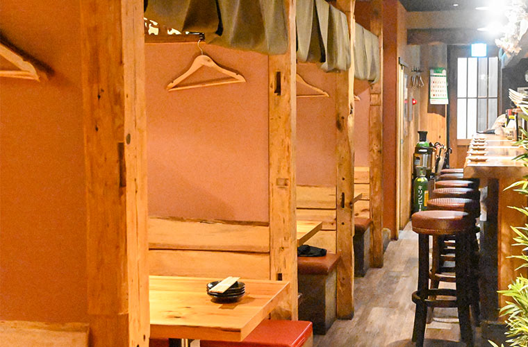 素材を大切にしながらも、若い世代にも気軽に立ち寄ってもらえるよう、肩ひじ張らずにゆったりと過ごせる雰囲気を大切にしています。一人で静かに楽しめるカウンター席、気の合う仲間と囲める4人掛けのボックス席、完全個室の座敷席も完備。シーンを問わず幅広く利用できます。