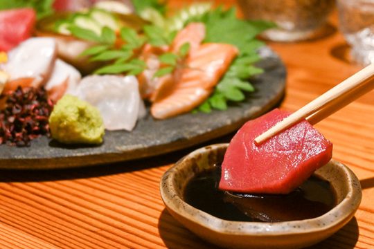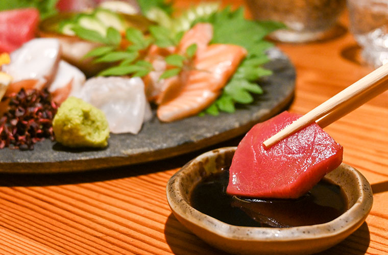 刺身醤油には、たつの市の老舗 「末廣醤油」 の合わせ醤油を使用。店主自らが龍野まで足を運び惚れ込んだという一本で、香り高くキレのある味わい。素材の味を最大限に引き出す、まさに名脇役です。