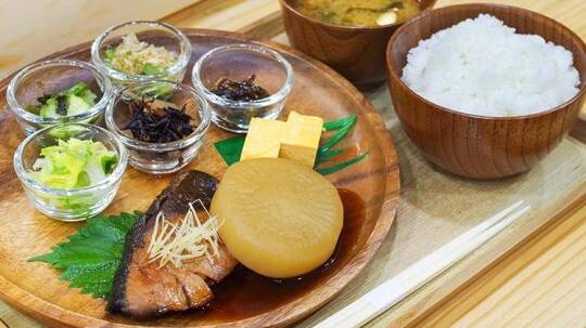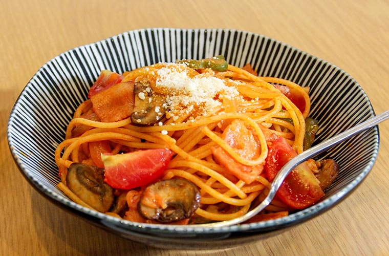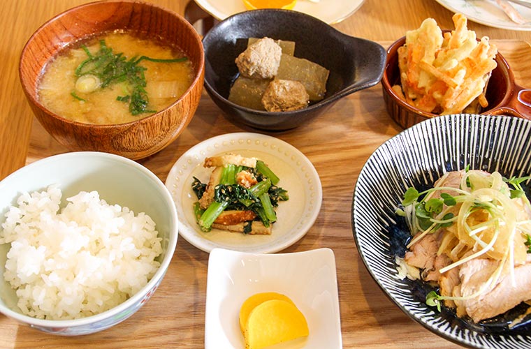 水・木曜日は『和食ランチ』の日。取材日は「ローストポーク」をメインに、「サツマイモとニンジンのかき揚げ」「冬瓜と肉団子炊き合わせ」「小松菜とちくわのゴマ和え」といった優しい味付けの小鉢3種がセットに。旬の食材にこだわる同店では一部、家庭菜園で採れた野菜も使用しています。また、最近は麹(こうじ)も積極的に取り入れ、さらに“優しさ”を追求しているそう。『和食ランチ』も日替わりなので、毎週通っても楽しみいっぱいのワンプレートです♪