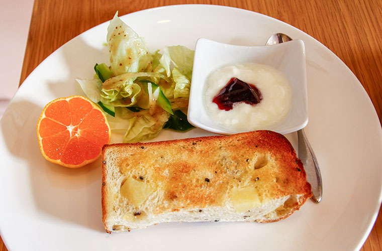 水・木曜日のモーニングは自家製「食パン」が楽しめます。取材日は「サツマイモとチーズの食パン」が登場。ふんわりとした生地の中に、ほくほくのサツマイモとチーズがバランスよく顔をのぞかせます。サツマイモの自然な甘さともちっとした食感の中にあるチーズのコクがアクセント!