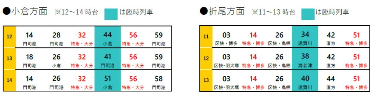 臨時列車は、小倉方面は正午~午後2時台に3本、折尾方面は午前11時~午後1時台に3本、黒崎駅から発車します。