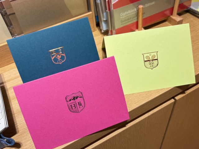 カードにデザイン箔を押して、自分だけの1枚を作れる「My Emblem mini」(1枚748円~)が関西初登場。ドイツ・グムンド社製の上質な二つ折りカード(全48色)に、好きな刻印図案と箔のカラーを自由に組み合わせてオーダーできます。