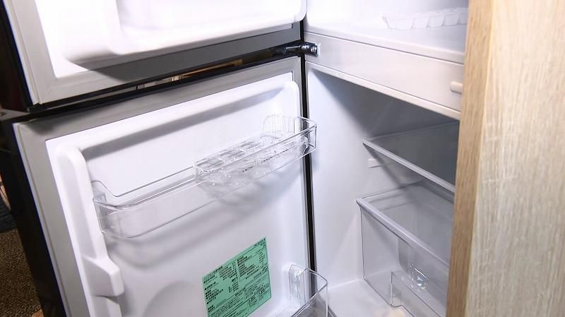 ハンガーがかけられるスペースがあり、冷凍庫がついた2ドアタイプの冷蔵庫も。