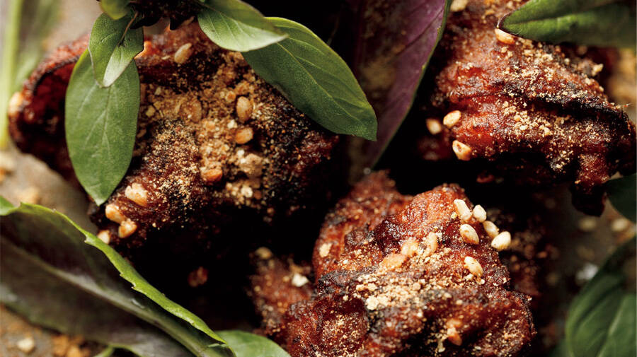 コリアンダー、ブラックペッパーをまぶし、ハチミツを加えて軽く和え、1時間ほど冷蔵庫で冷やす。