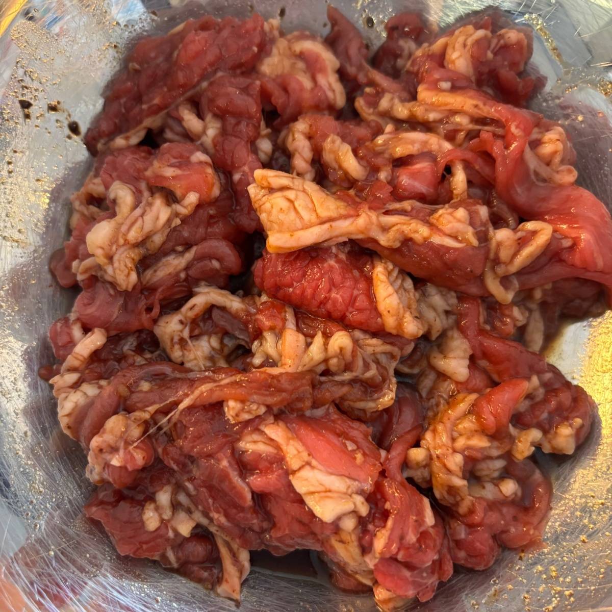 牛肉は食べやすい大きさに切り、Aを揉みこんで15分ほど置きましょう。