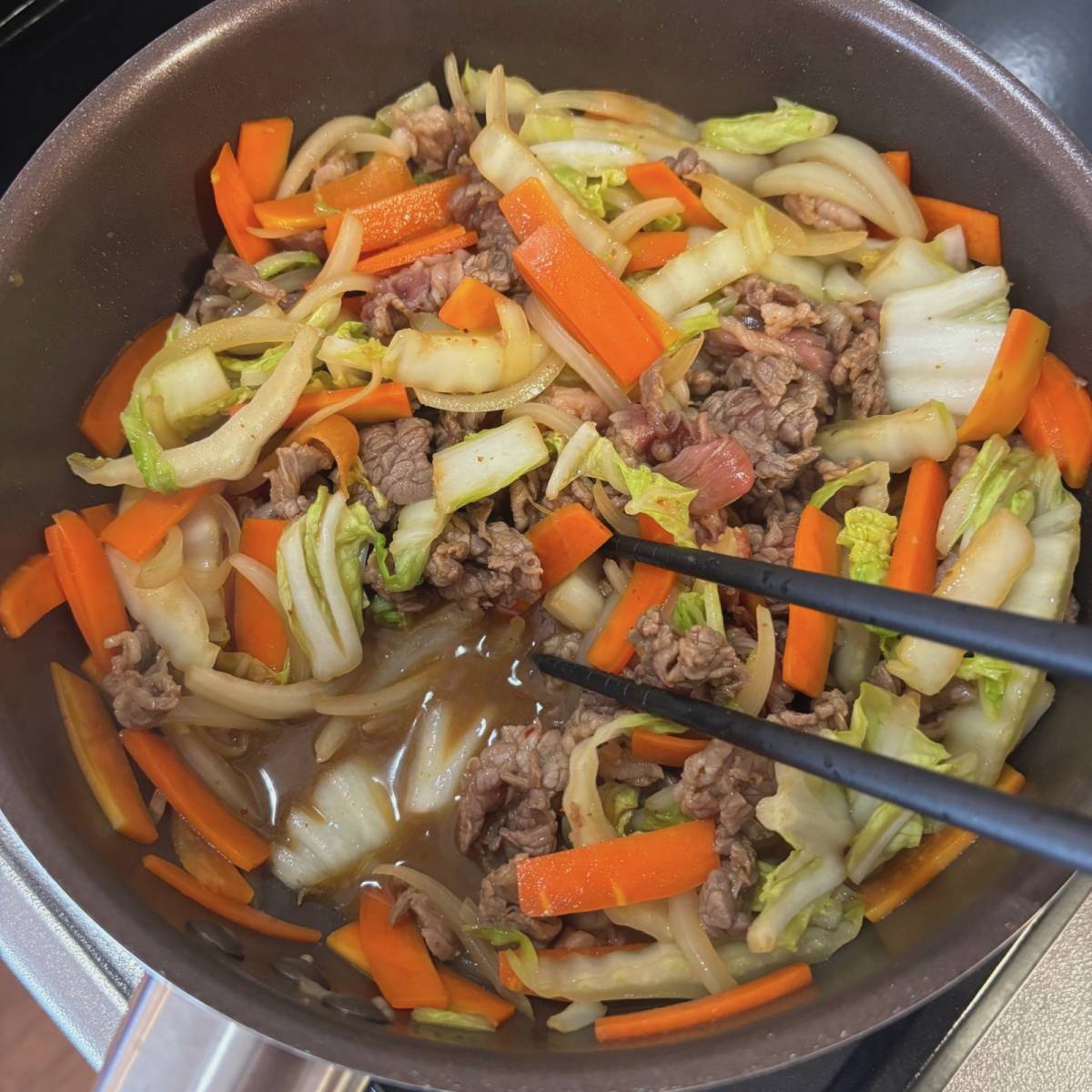 続いて白菜の葉と①を汁ごと加え、牛肉に火が通るまで炒めればできあがりです♪