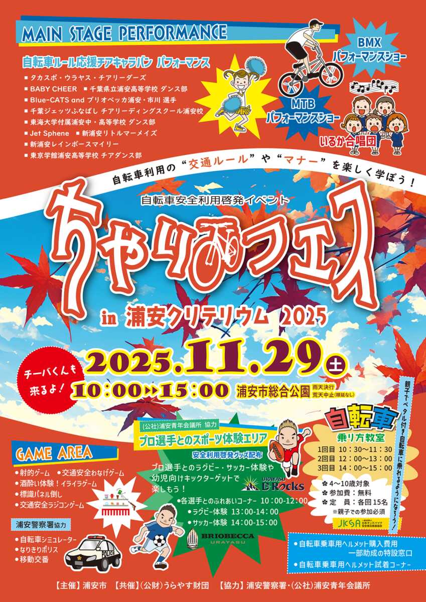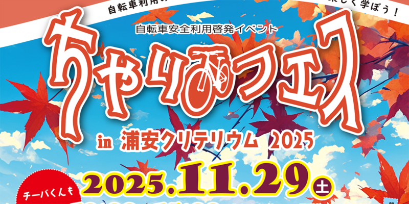 11月29日(土)に浦安市総合公園にて、「ちゃりフェスin浦安クリテリウム2025」が開催されます!ちゃりフェスは、自転車事故を未然に防ぐため、誰でも気軽に使用できる自転車が「車両」である事の意識を高め、自転車利用における「交通ルール」「マナー」「安全」を楽しく学ぶことを目的としています。