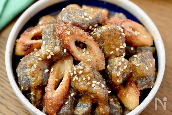 最後は、コスパの良い「こんにゃく」と「ちくわ」で簡単に作れる、ごま味噌煮をご紹介。こんにゃくはしっかり炒めると味が入りやすくなり、食べ出したら止まらない危険な美味しさに♪ 夕飯のおかずはもちろん、お弁当やおつまみにもおすすめですよ!