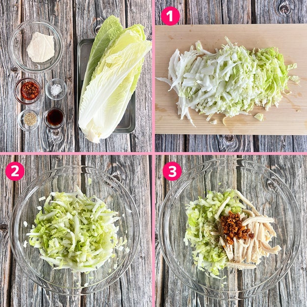 ① 白菜は長さ4cmくらいの千切りにする。サラダチキンも千切りにする。