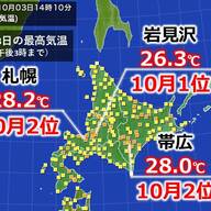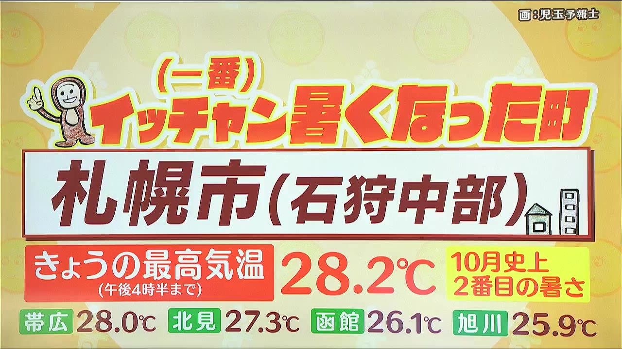 きょう3日(金)の道内でイッチャン暑くなった町です。最高気温は28.2度で札幌としては10月の観測史上2番目の暑さになりました。ちなみにきょう3日(金)は、帯広や北見、函館、旭川などでも夏日になりました。あす4日(土)も季節外れの気温が続きます。