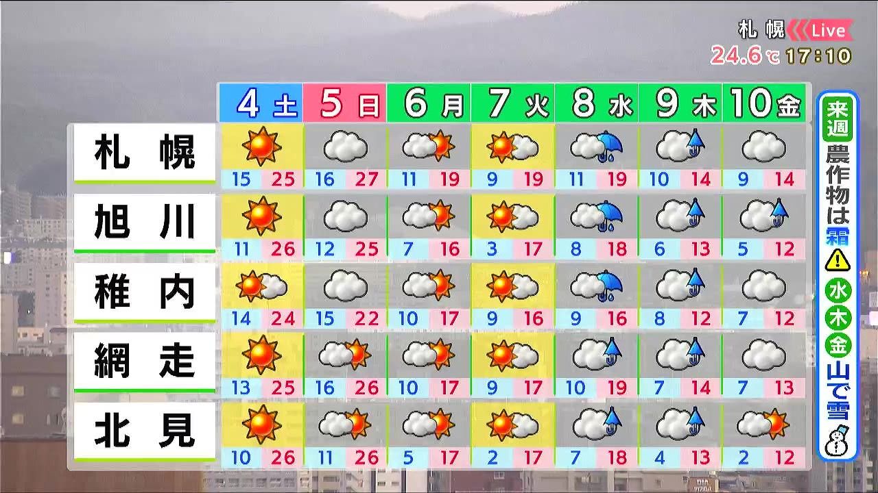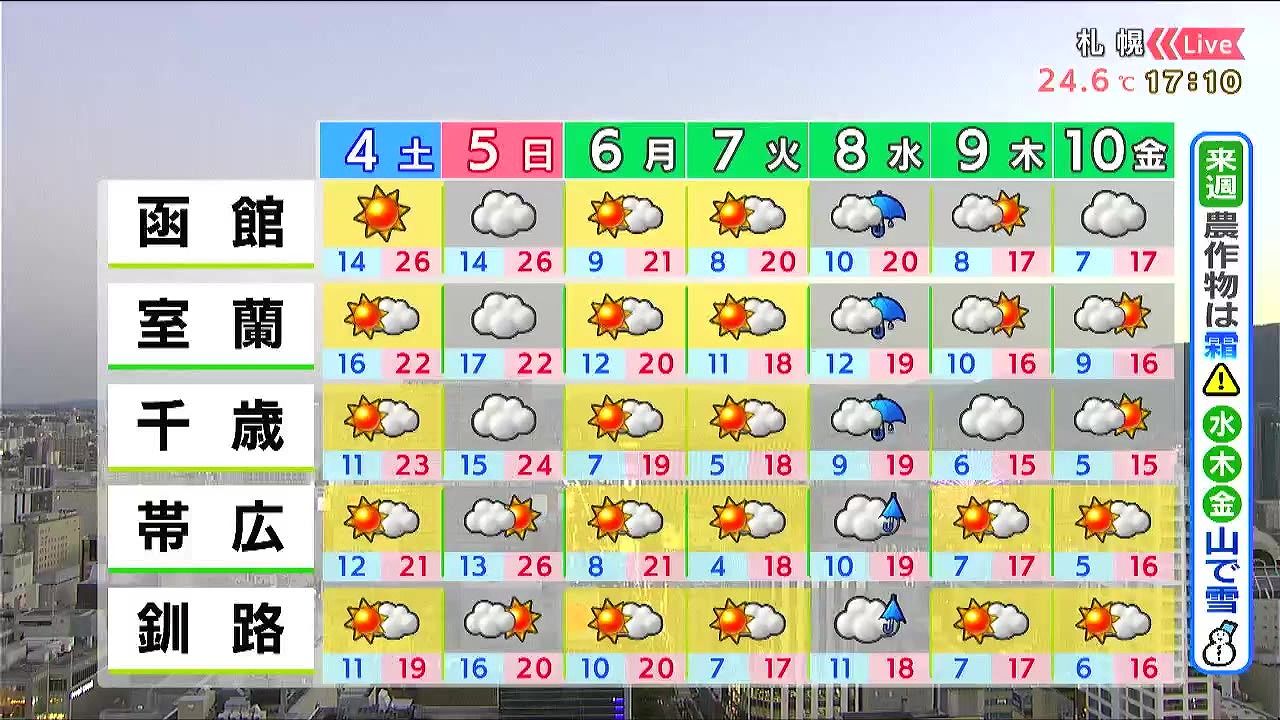 日曜の午後は道南方面で弱い通り雨があるでしょう。月曜と火曜は晴れますが、特に火曜の朝は内陸で5度以下となるため、霜に注意して下さい。水曜の雨のあとは一段と涼しくなります。