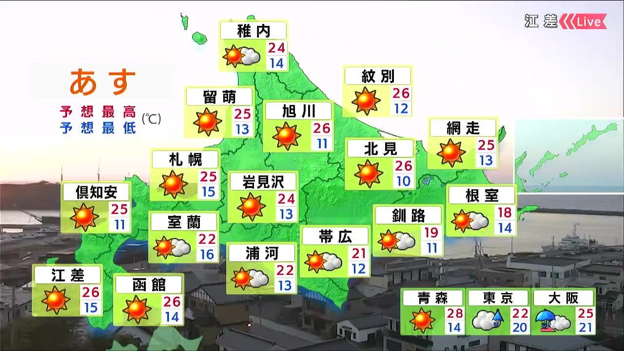 各地で晴れるでしょう。最高気温はきょう3日(金)と同じか若干低くなりますが、旭川や函館、道南の江差でも26度、札幌は25度の夏日になります。帯広はきょう3日(金)より7度低い21度でしょう。