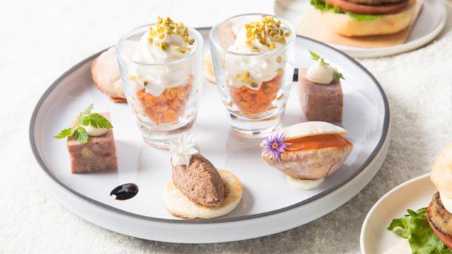 1段目:セイボリー(サバのリエット、サーモンムースのピタパン など)