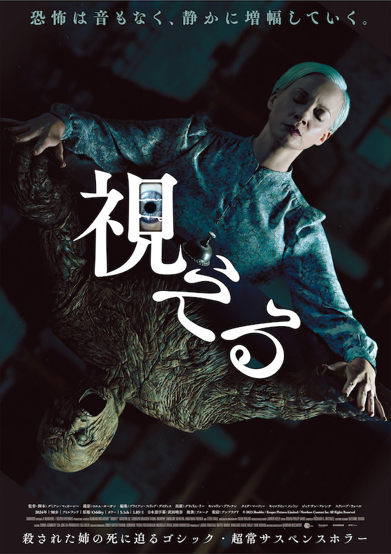 本ビジュアルは、盲目の霊能力者・ダーシーと、不気味な木製マネキンが対になり、不穏な闇の中に浮かび上がる姿が切り取られている。大きく配された邦題の『視える』という文字には、人間の眼が重ねられ、得体の知れない不安を可視化したデザインに仕上がった。キャッチコピーは「恐怖は音もなく、静かに増幅していく」。惨劇から一年後、姉を失った妹が屋敷を訪れることで再び動き出す恐怖を予感させ、観る者に強烈な印象を残すビジュアルとなっている。