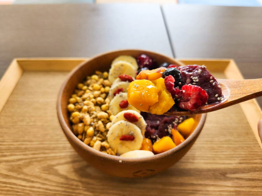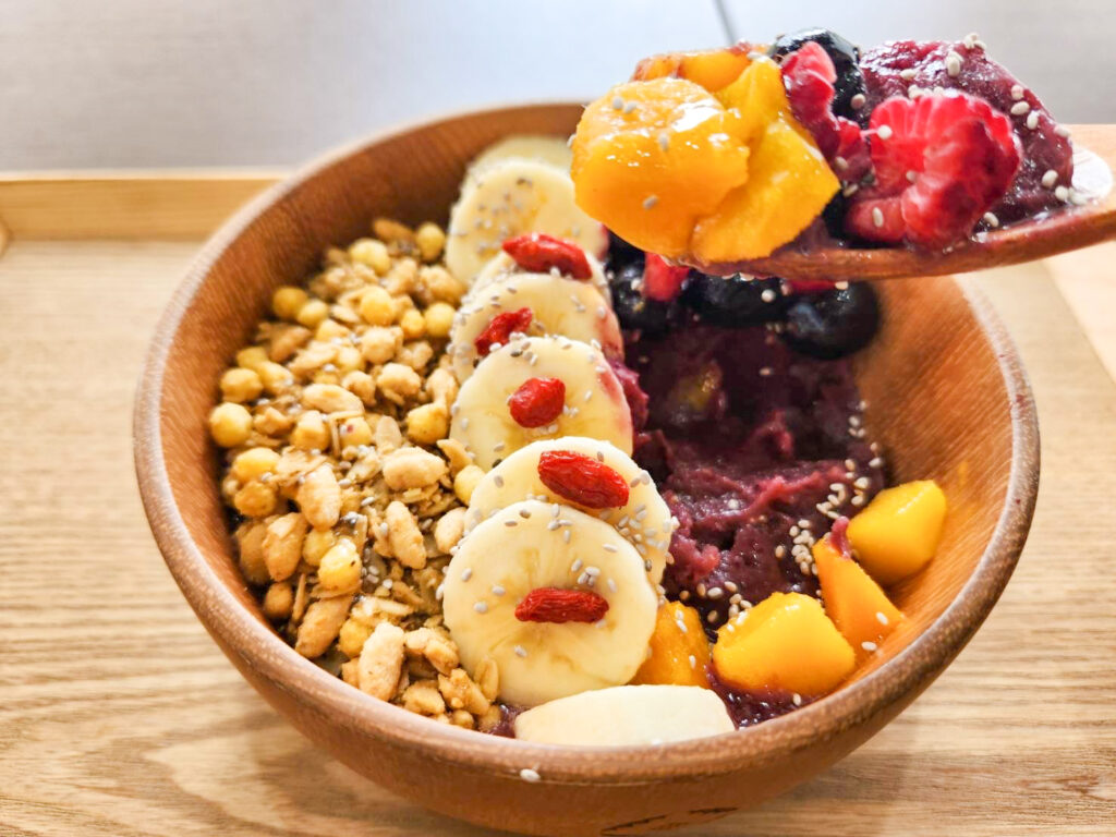 栄養価の高いアサイーをピューレ状にしたものに、フルーツやグラノーラなどをトッピングした「アサイーボウル」。