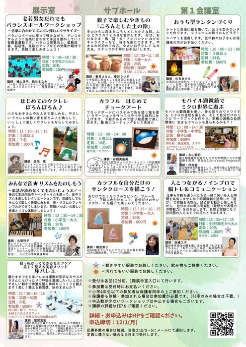 各ワークショップへの参加申込は、12月1日(月)〆。(応募多数の場合は抽選、当落は12/3~5にメールで全員へ通知)