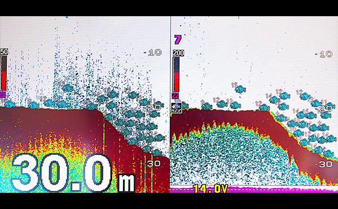 明石沖の鉄板ポイント 水深20〜30mのカケアガリで上げの潮が動き始め30分、魚探反応には最近見ていないベイトの反応が出ています。
