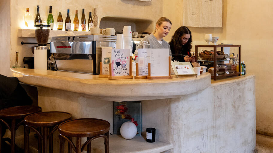 店内は、壁のパテ跡や石膏ボードの地肌をあえて残したつくりで、一瞬、「これで完成?」と思う空間です。