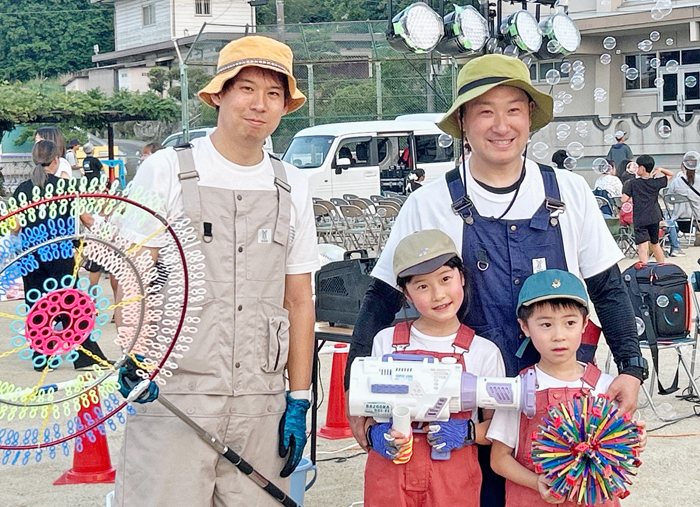 角田ファミリーは今後、9月27日に津市である「津夏祭り」、10月12日に名張市内である「隠街道市」でのパフォーマンスを予定。活動はインスタグラム(@shabondama_nabari)でも紹介している。