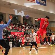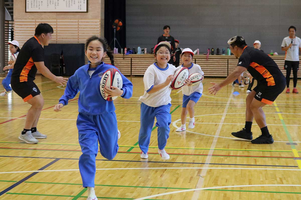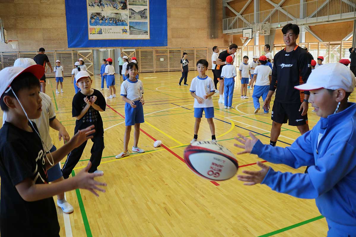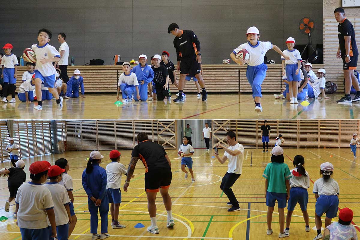 大熊克哉(29、フッカー)、青木祐樹(33、ロック)、末永健雄(31、フランカー)、古賀駿汰(28、SH)、ハラトア・ヴァイレア(26、CTB)の5選手が来校。パスやラインアウトの実演でラグビーの特徴的プレーを紹介した後、児童が5グループに分かれてボールに親しむメニューを楽しんだ。グループ対抗で、選手と輪になってパス回しの速さを競ったり、ボールを持って走るリレーで盛り上がったり…。合間にはグループで作戦会議もするなどチームワークも体験。最後は選手が並ぶディフェンスを突破するゲームも行い、体育館には児童らの大きな歓声が響いた。
