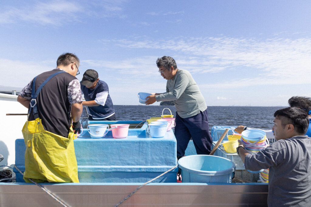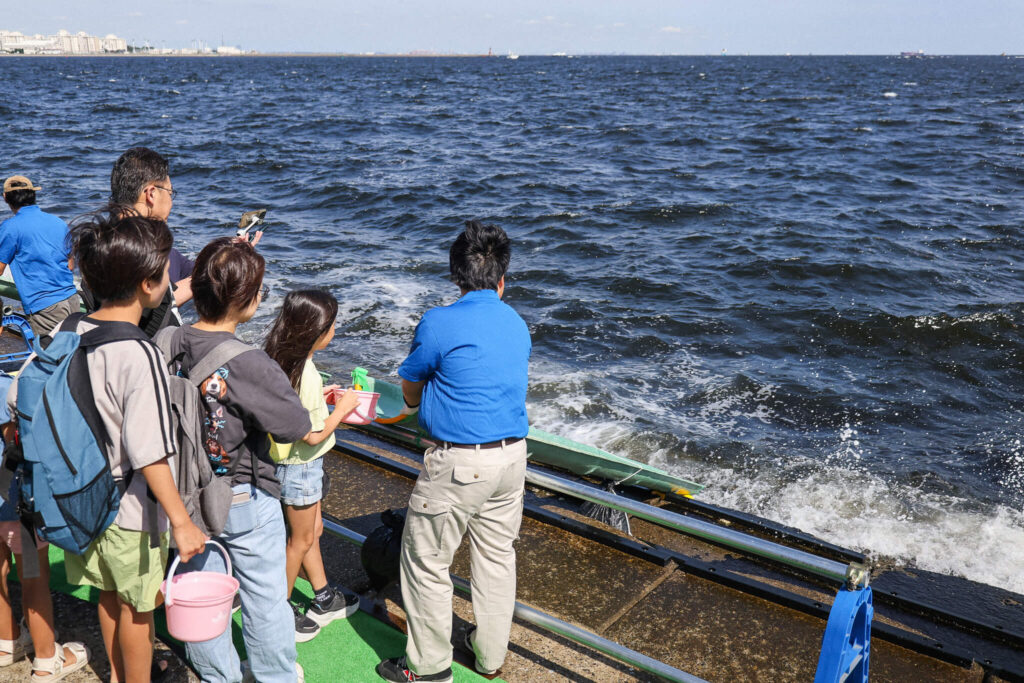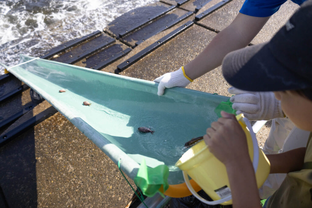 魚を釣る姿は目にすることがあっても、海へと戻す体験はなかなかできないもの。子どもたちは真剣な表情でバケツを持ち、滑り台のようにそっと海へ流していました。