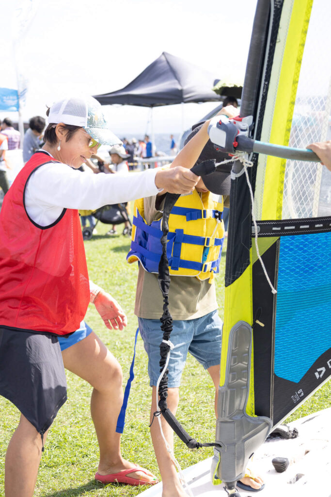 今回は強風・高波のため、マリンアクティビティの多くが中止になりましたが、『プールでSUP体験』や、『ウィンドサーフィン体験』など公園内でも楽しめる内容が用意されており、家族連れの長い列になっていました。