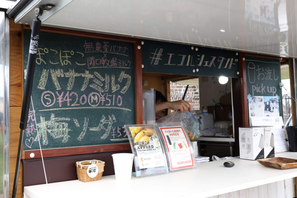 キッチンカーのエリアでは、『エコルシェスタンド』でバナナジュースを目当てに列に並びました。時より日差しも強く感じていたので、冷たいバナナジュースが体に染みます。マイボトル持参で30円引きになるなど、環境に考慮した取り組みがみられました。