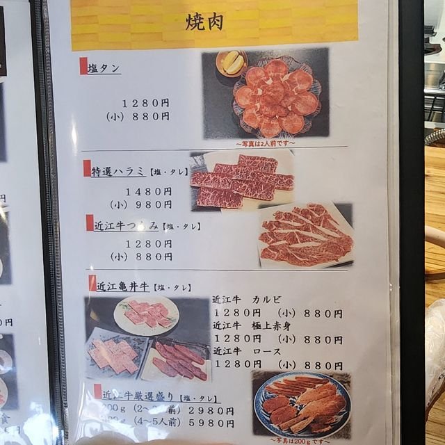 アラカルトメニューの一部ですがお値段はこんな感じです。当日は牧場のほうがお休みらしく、レバーなどの一部のホルモンが売りきれ中。私は「近江牛焼肉定食」を、相方はこういう時でないと食べられないのでチャレンジだ!と「土鍋ハンバーグステーキ定食」を注文し、追加のお肉でまた「近江牛つらみ(タレ)」を注文するのだ。