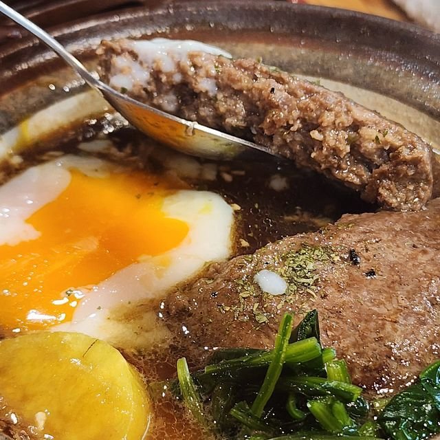 ババーンですな。洋食屋さんではないので、煮込みソースはデミグラスはないのですが、ちょっとすき焼きっぽい、甘口醤油系の和風の煮込みになっていまして、温玉とさつまいも、それにほうれん草が添えてあるのが健康健全的。量は結構しっかり!