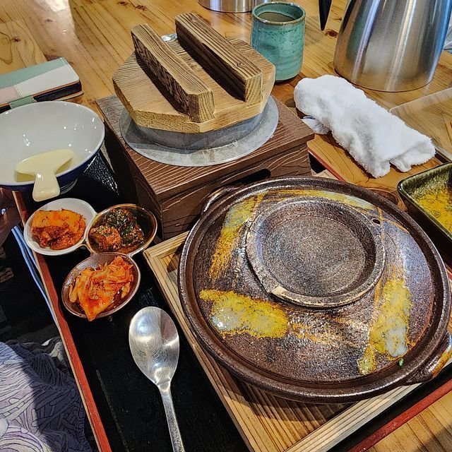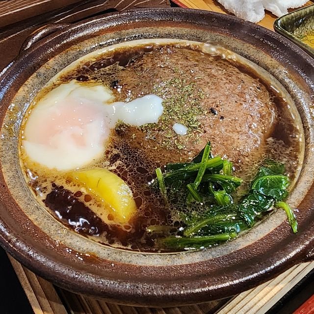 と、お肉を半分ほど頂いた段階で、相方注文「土鍋ハンバーグステーキ定食」も登場。メインの土鍋を開けますよ!