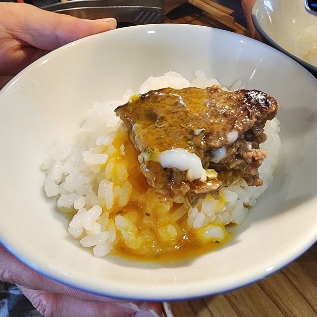 ハンバーグを持ち上げてみた図。若干柔らかめで厚みは2cmほどですかね。これぐらいのサイズ感です。ま、これに釜炊きご飯が付いているので満腹は必至。で、焼肉をシェアした代わりに、ハンバーグ半分ほどは・・・
