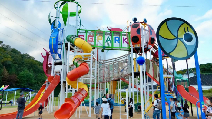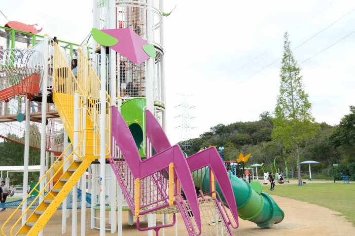 すでに多くの子供達が楽しんでいたのは、同公園の象徴ともいえる大型複合遊具。大きな木がモチーフになっており、クワガタムシやテントウムシなど、たくさんの色鮮やかな昆虫が木(遊具)に止まっています。