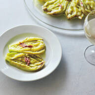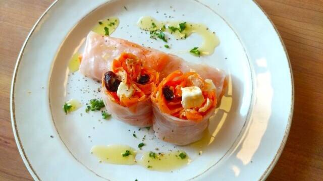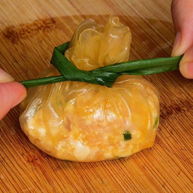 ④ ライスペーパーに②の1/6量をのせて包み、小ネギ(8cmの長さ)で縛る。同様にあと5個作る。