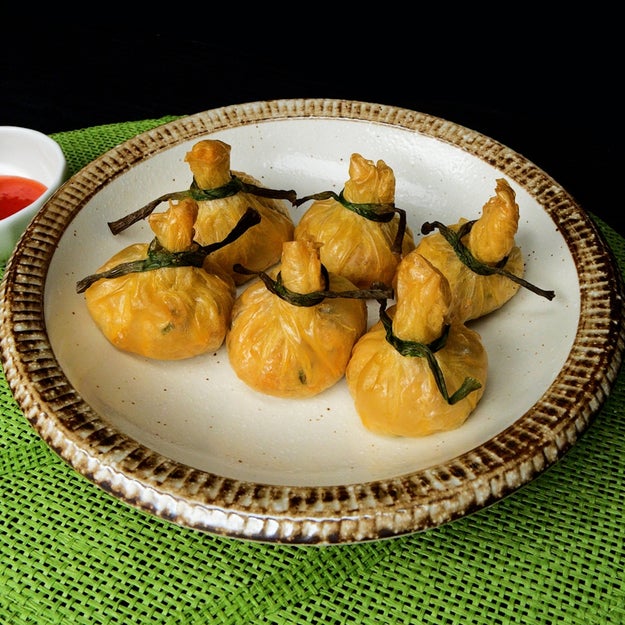 豆腐と鶏ひき肉をぎゅっと巾着に♡ライスペーパーでジューシー焼き、ぜひ作ってみてね♪