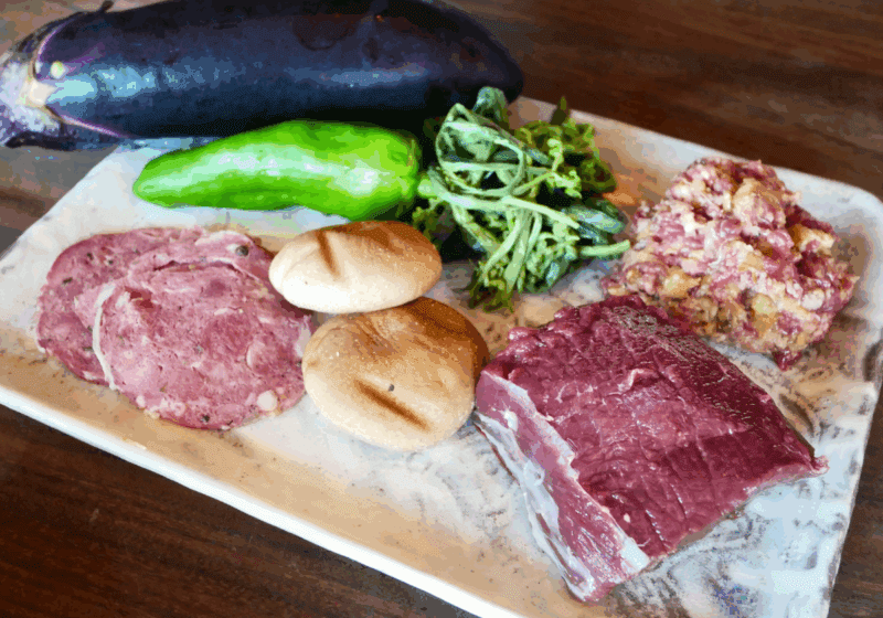 次は、「シカ肉のグリル」です。「ソースもいいけれど、田舎のごはんならこれ。ごはんに乗せても美味しいんですよ」と添えてくれたのは、山菜と野草を焼きなすで和えたもの。