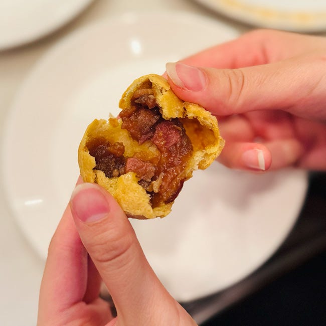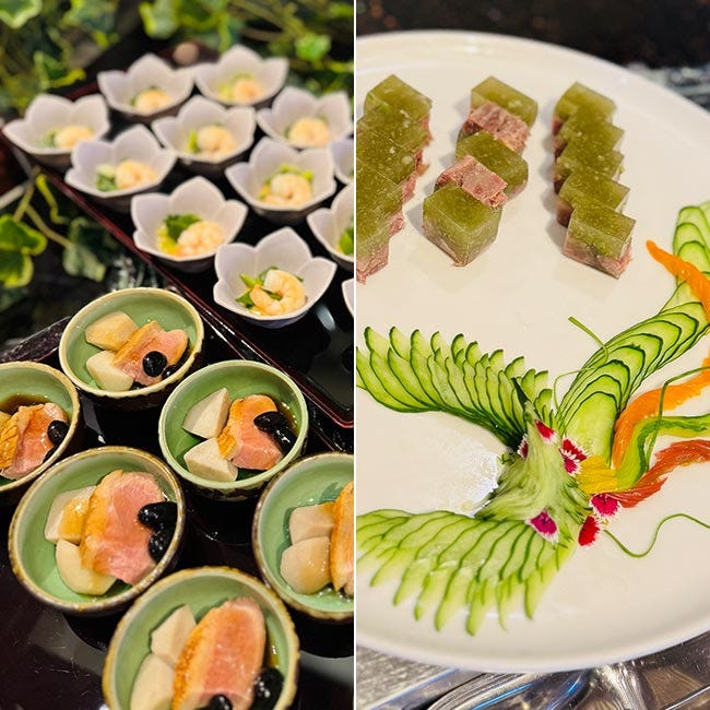 再び前菜を持ってこようと思ったタイミングで、銅鑼が鳴り響きました! 新商品「チャーシューメロンパン」のお出ましです。小ぶりなサイズで、いろいろ食べたいビュッフェにぴったりですね。