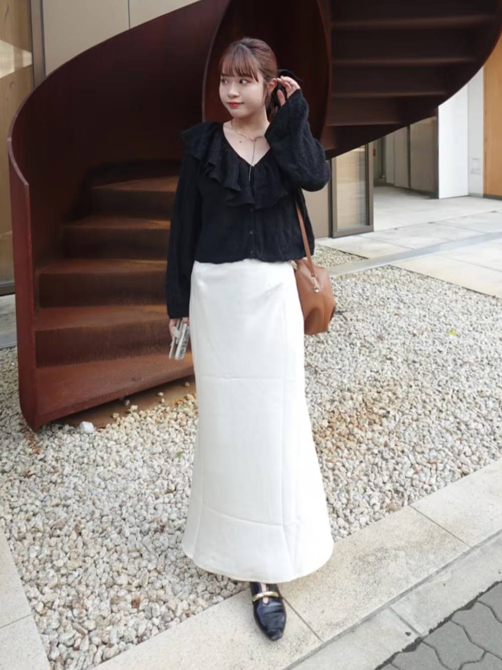 ボトムスには、マーメイドシルエットの白スカートを選ぶと◎